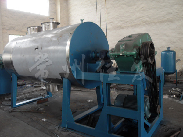 本機(jī)是一種新型臥式間歇式真空干燥設(shè)備,濕物料經(jīng)傳導(dǎo)蒸發(fā),帶有刮板攪拌器不斷清除熱面上的物料,并在容器內(nèi)推移形成循環(huán)流,水份蒸發(fā)后由真空泵抽出。