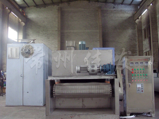 物料由加料器均勻地鋪在網(wǎng)帶上,網(wǎng)帶一般采用12-60目不銹鋼絲網(wǎng),由傳動(dòng)裝置拖動(dòng)在干燥機(jī)內(nèi)移動(dòng)。干燥機(jī)由若干單元組成,每一單元熱風(fēng)獨(dú)立循環(huán),部分尾氣由專門濕風(fēng)機(jī)排出,廢氣由調(diào)節(jié)閥控制,熱氣由下往上或由上往下穿過(guò)鋪滿物料的網(wǎng)帶完成熱量與質(zhì)量傳遞的進(jìn)程,帶走物料的水份。網(wǎng)帶緩慢移動(dòng),運(yùn)行速度可根據(jù)物料溫度自動(dòng)調(diào)節(jié),干燥后的成品連續(xù)落入收料器中。上下循環(huán)單元根據(jù)用戶需要可靈活配備,單元數(shù)量亦可根據(jù)需要選取。