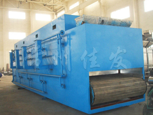 The material is evenly laid on the mesh belt by the feeder, and the mesh belt is generally made of 12-60 mesh stainless steel wire mesh, which is dragged by the transmission device and moved inside the dryer. The dryer is composed of several units, each with independent circulation of hot air. Part of the exhaust gas is discharged by a dedicated wet fan, and the exhaust gas is controlled by a regulating valve. The hot air passes through the mesh belt covered with materials from bottom to top or from top to bottom to complete the process of heat and mass transfer, taking away the moisture of the materials. The mesh belt moves slowly, and the running speed can be automatically adjusted according to the material temperature. The dried finished product continuously falls into the feeder. The upper and lower circulation units can be flexibly equipped according to user needs, and the number of units can also be selected according to needs.